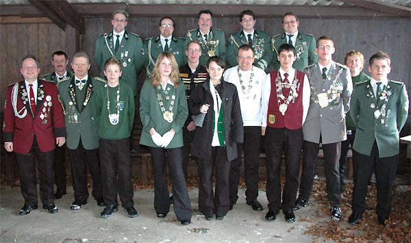Sven Göbgen (vorne, 4.v.re.) wurde Bezirksschülerprinz. Jörg Heinen (3.v.re.) belegte beim Bezirksjungschützenprinzenschießen den zweiten Platz.