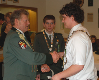 Bezirksbundesmeister Hermann-Josef Jakobs gratuliert dem neuen Bezirksprinzen Markus Krumpen |