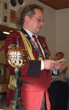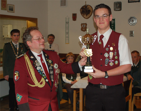 | Manfred Müller gibt die Ergebnisse der Schießwettbewerbe bekannt und überreicht den Hubert-Elsen-Pokalan an Daniel Jäger. |