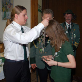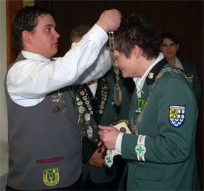 | Karsten Krumpen übergibt der neuen Bezirksschülerprinzessin Lisa Knoll aus Marmagen die Bezirkskette. |