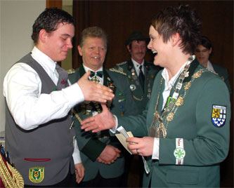 der neuen Bezirksprinzessin Susanne Eßer die Bezirkskette und gratuliert ihr als Erster